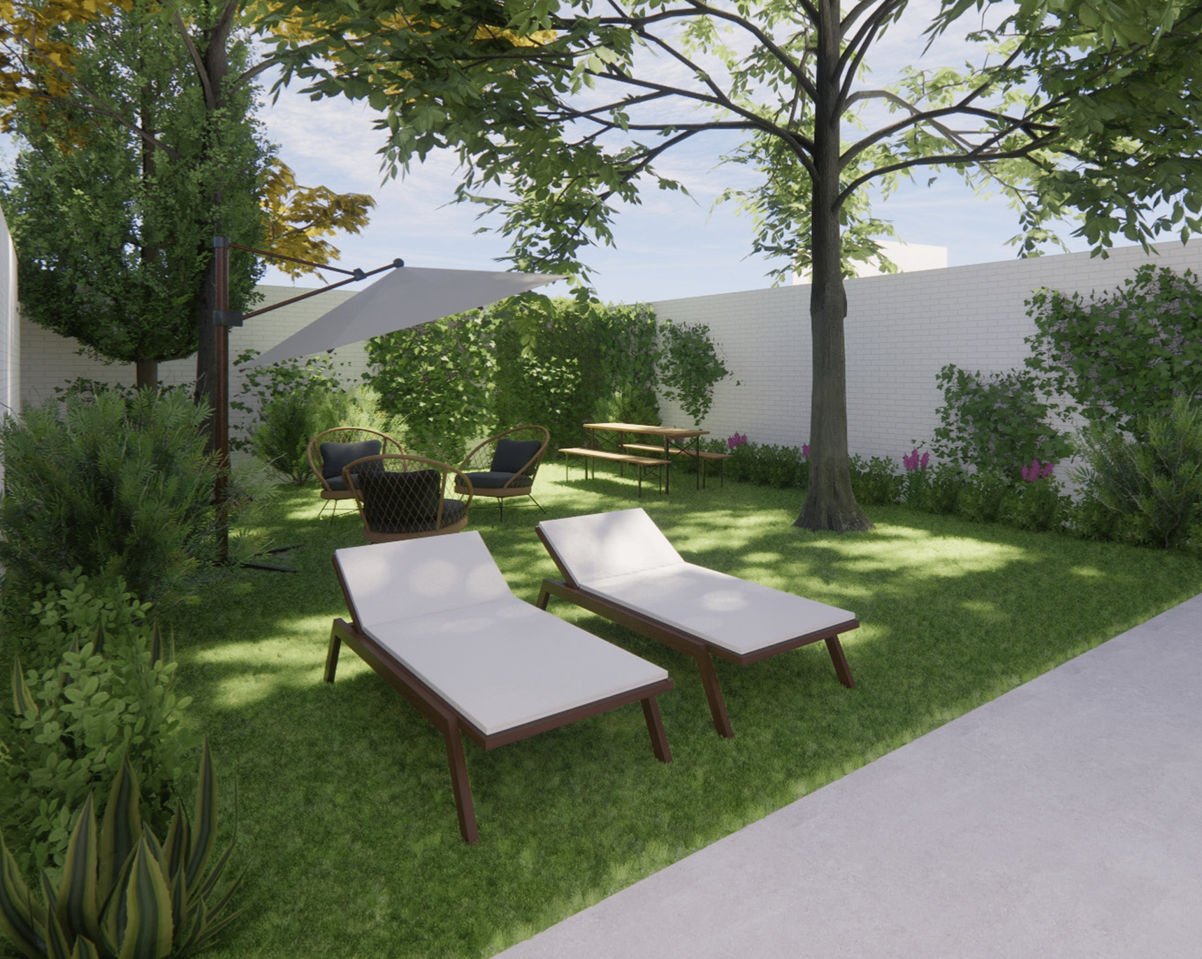 Los espacios exteriores incluyen una terraza y un patio privado, ambos conectados directamente con el interior y con una zona comunitaria compartida que incorpora piscina, jardín, tumbonas y área de pícnic, creando un entorno natural y relajado.