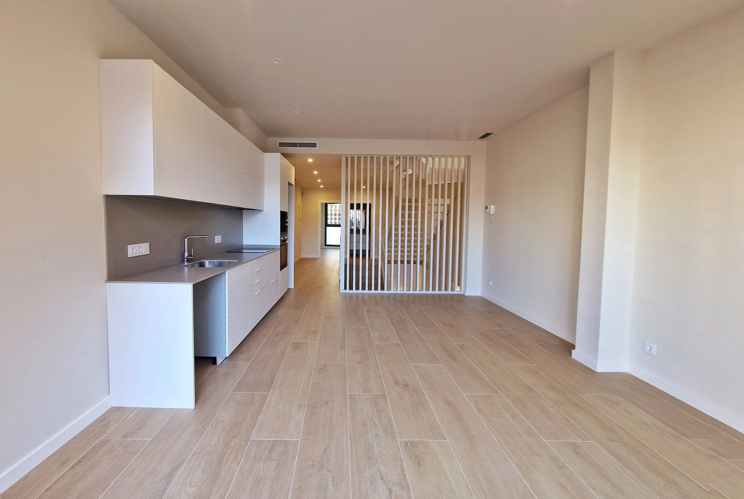 Reforma integral de una vivienda existente, configurada con 3 habitaciones y 2 baños. El proyecto incorpora un patio que aporta iluminación y ventilación natural, mientras que un amplio lucernario central inunda de luz las zonas de distribución.